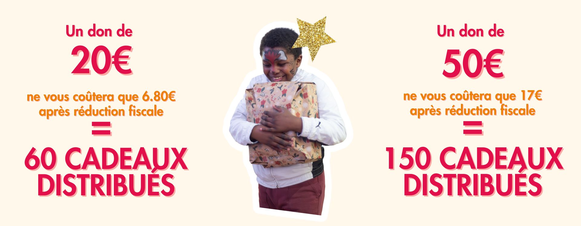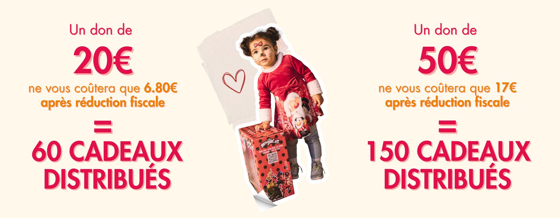 Vous aussi, devenez le Père Noël de quelqu’un dans le besoin ! En faisant un don de 1€, vous permettez de distribuer 3 cadeaux à des enfants, familles et personnes isolées.